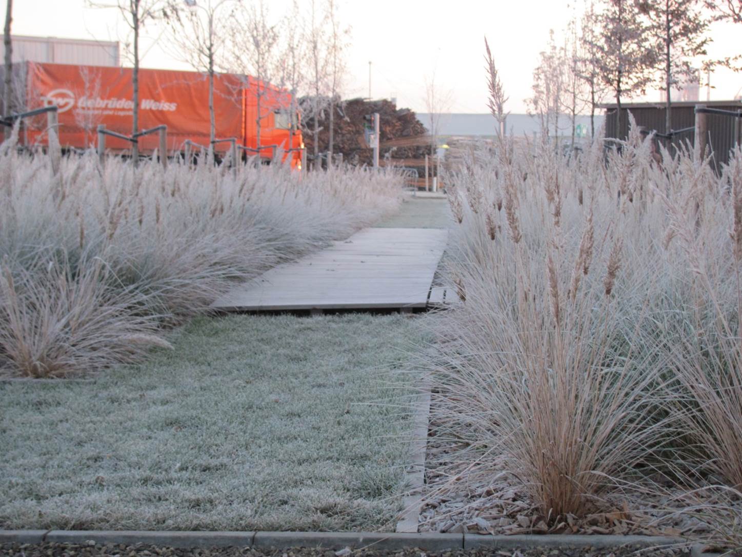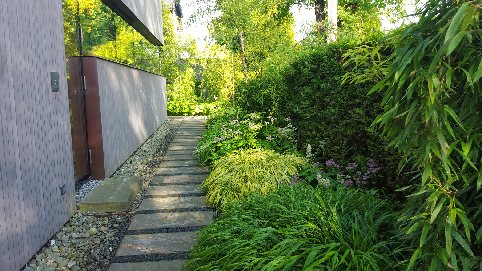werden auch Kiesflächen mit bewussten Steinsetzungen und Bäume mit bizarren Strukturen integriert. Bunte Farbstauden sind nur minimal als Akzente vorhanden und werden in Symbolgestalt
